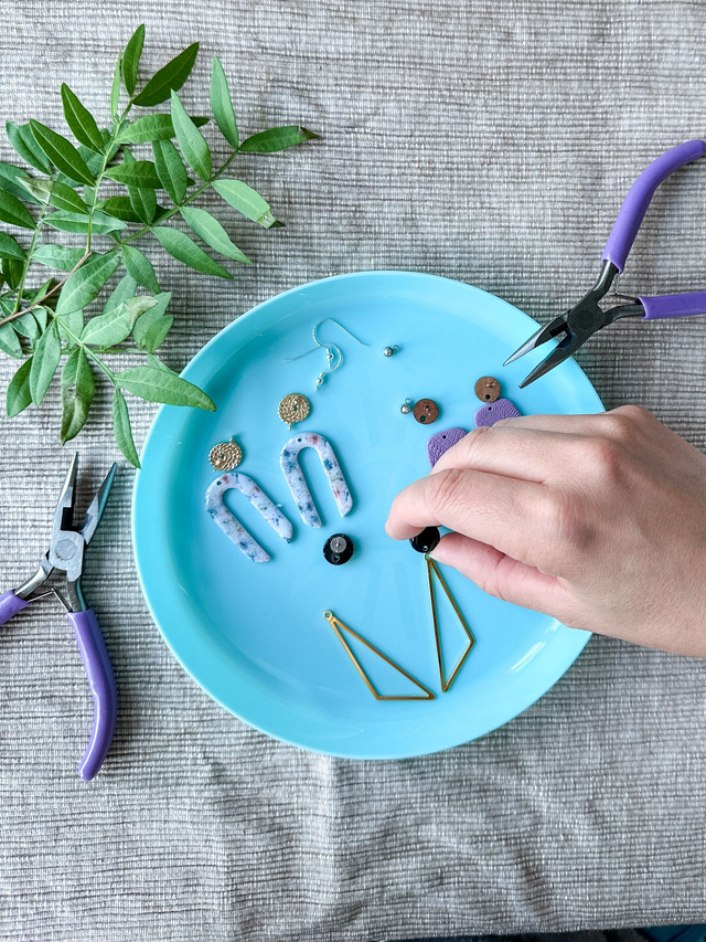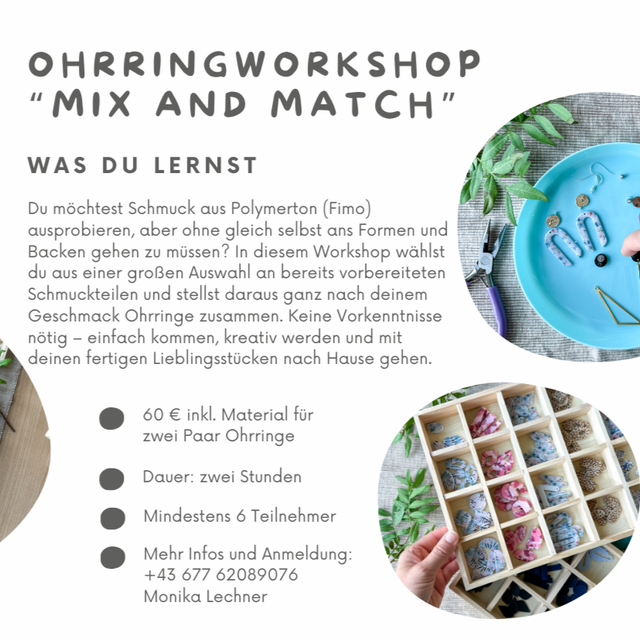 In diesem Mix & Match Workshop kannst du Schmuck aus Polymerton (Fimo) ganz unkompliziert kennenlernen – ohne selbst formen oder backen zu müssen. Du wählst aus einer großen Auswahl an bereits vorbereiteten Schmuckelementen und stellst daraus nach deinem Geschmack zwei Paar individuelle Ohrringe zusammen.