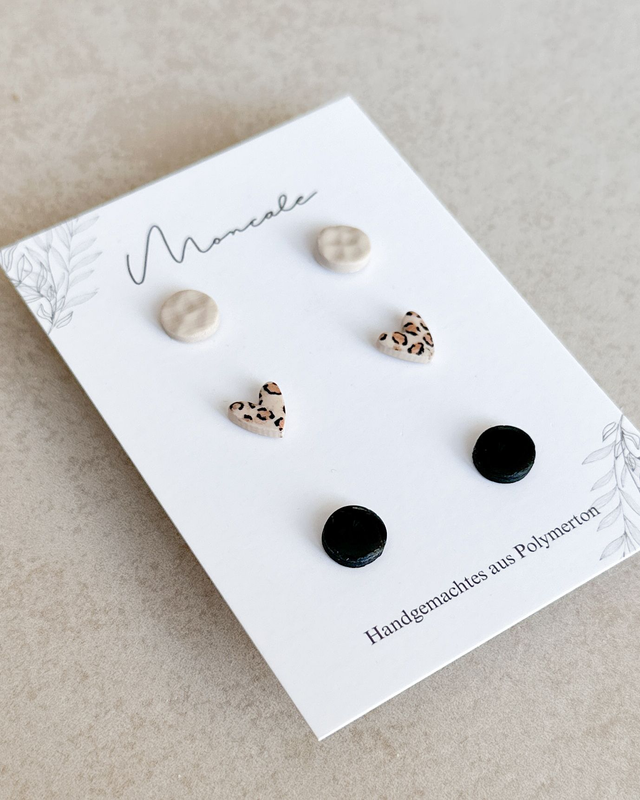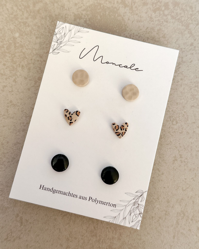 Handgemachtes Ohrstecker-Set aus Polymerton mit modernem Leoprint – leicht, zeitlos und perfekt für den Alltag. Dezentes Schmuckstücke, die sich vielseitig kombinieren lassen. Beige matt rund, Leoprint Herz und Schwarz glänzend rund.