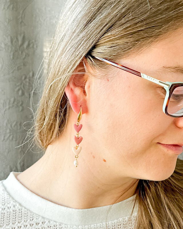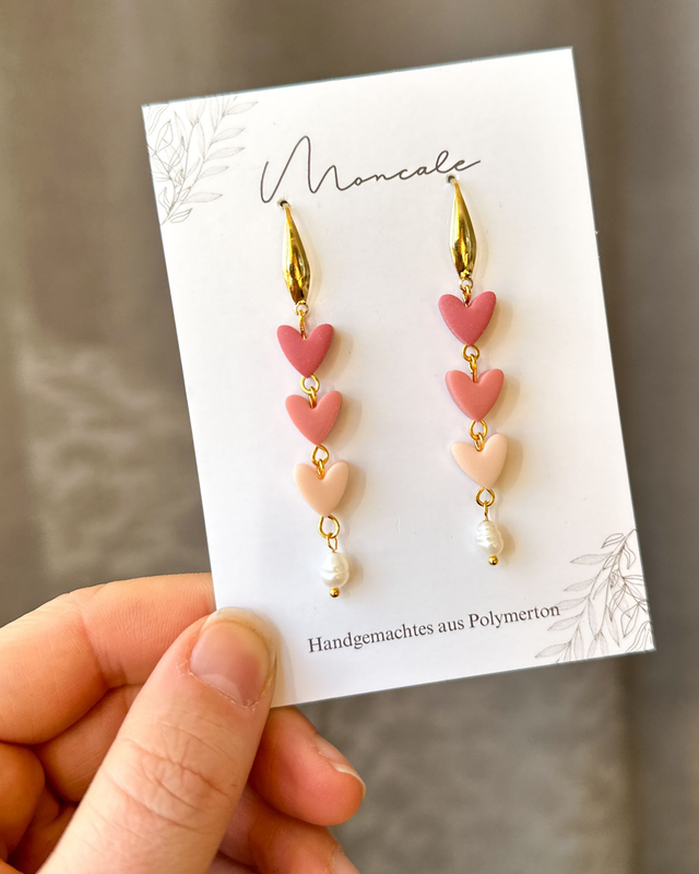 Verspielte Ohrhänger mit mehreren Herzen aus Polymerton – handgemacht und voller Bewegung. Ein romantischer Blickfang für besondere Anlässe oder als Statement im Alltag💛
