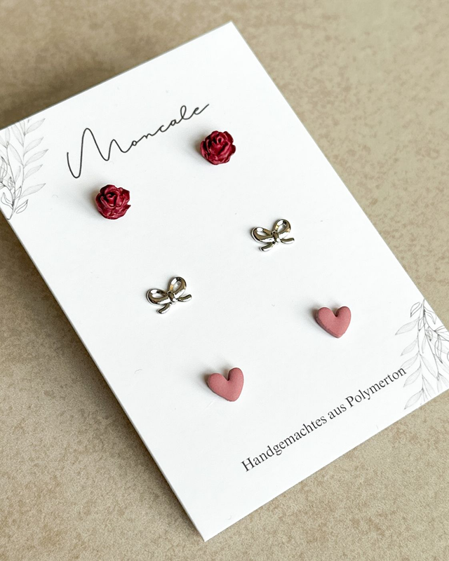 Handgemachtes Ohrstecker-Set aus Polymerton mit drei liebevollen Motiven zum Valentinstag. Ideal zum Kombinieren, Mix & Match oder als vielseitige Geschenkidee đź’›